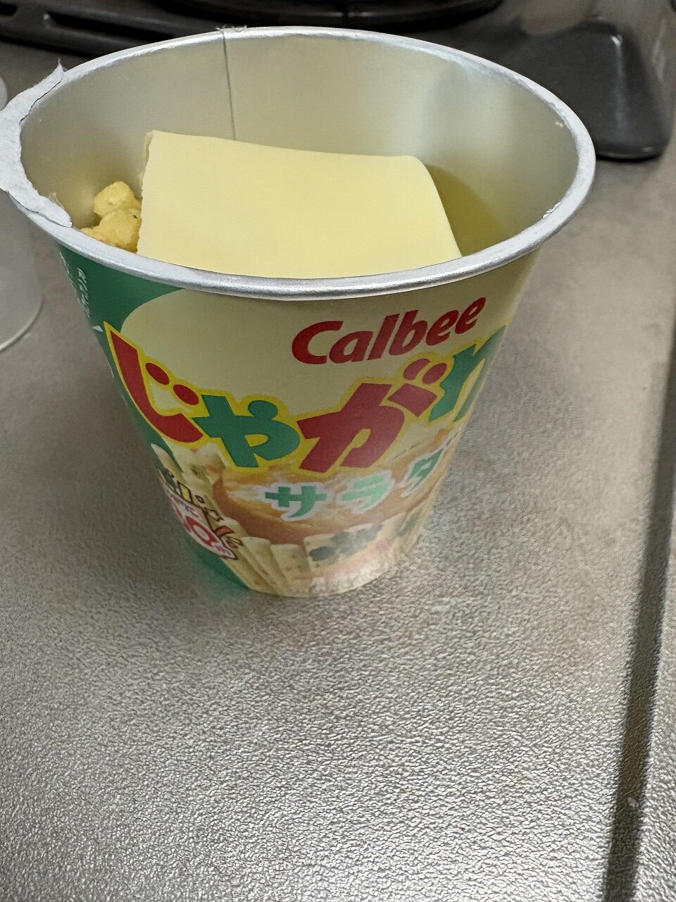 しっかり聴いてなかったため、「じゃがりこにお湯を入れて食べる」という部分だけが記憶に残っていて事務員さんとその話をしていたら事務員さん宅はチーズをインするそうで、自分も真似てみました。